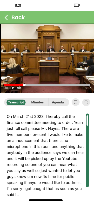 Meeting video player, including an interactive transcript, meeting minutes, agenda, and comment section. The search function can be used to filter through each section.