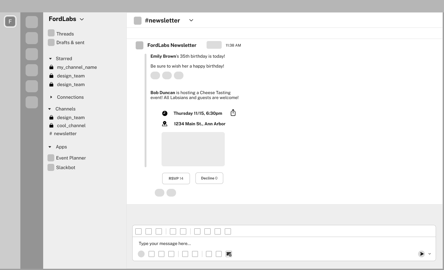 Our final solution incorporated our three design prototypes that we experimented with: The Pinterest-Inspired Event Planner, the Office Newsletter, and the Raid Notifications.